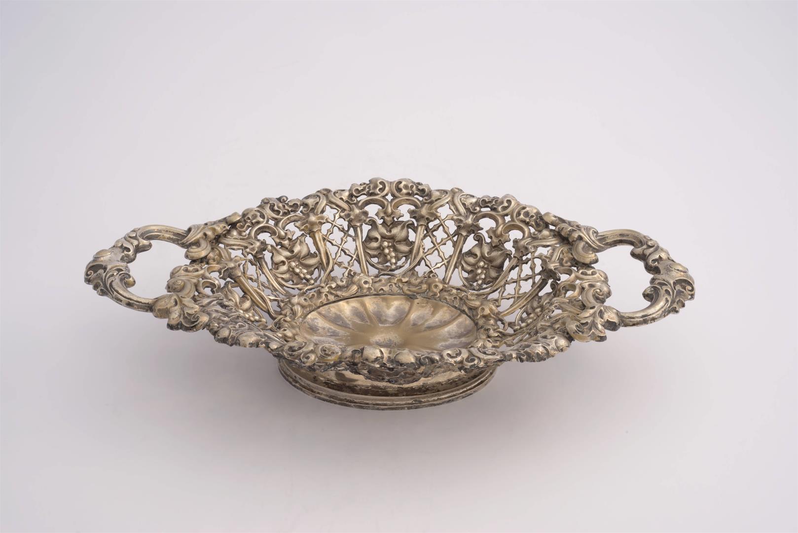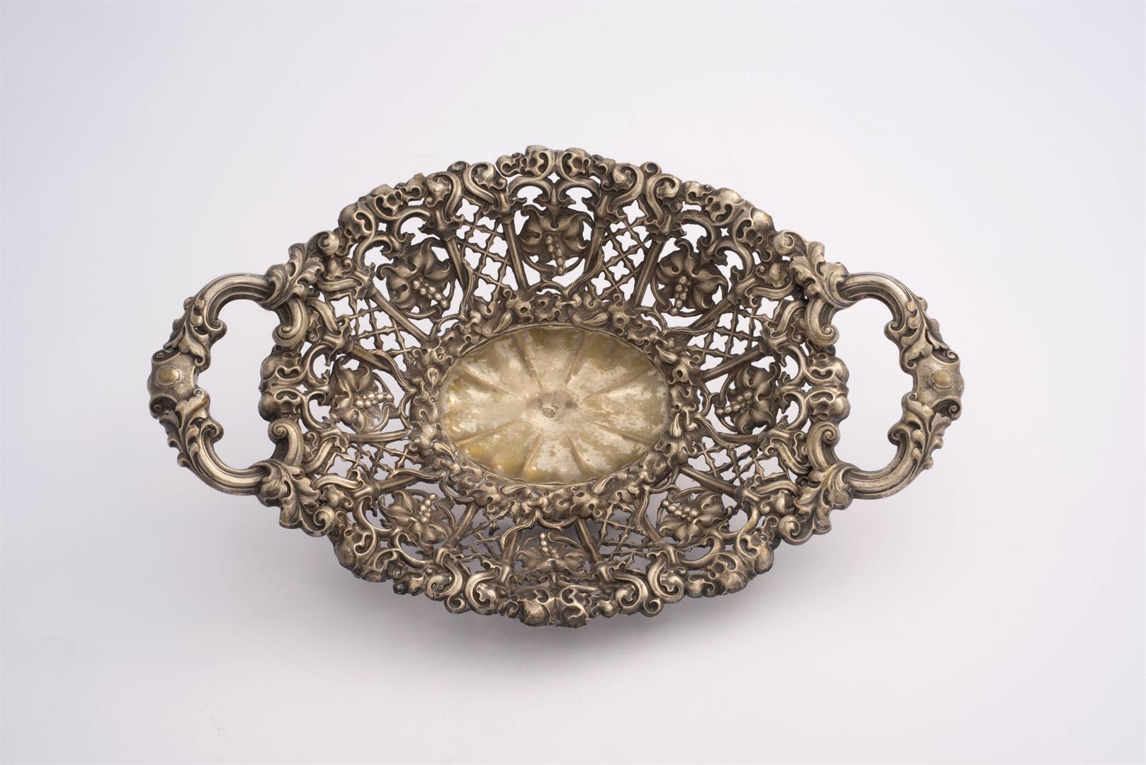 Cestinha com duas alças; trabalho rendilhado e vazado, muito leve, provavelmente prata italiana recente. Faz par com o nº 1110.;