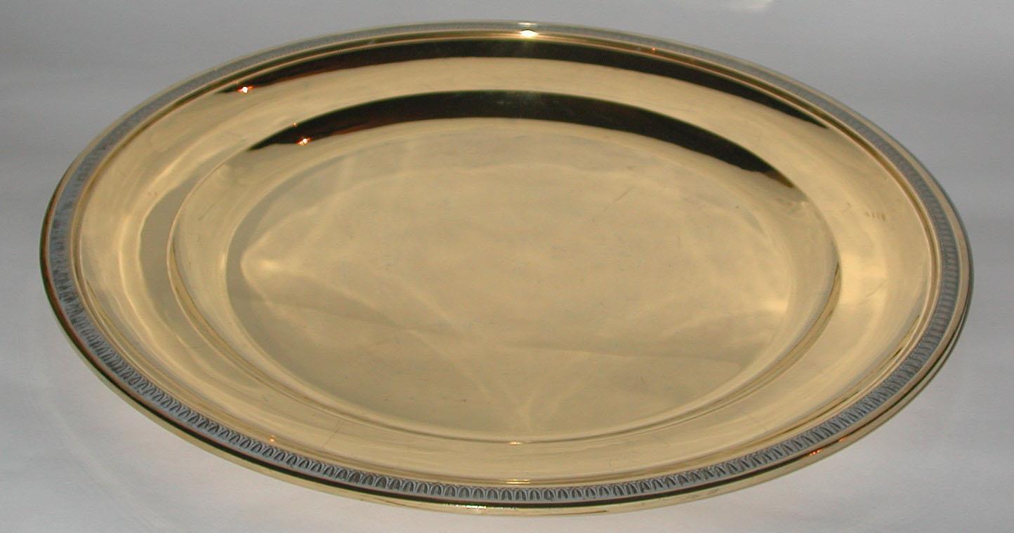 Travessa redonda que faz parte de um conjunto de 06 travessas em vermeil, lisas com friso na borda.;