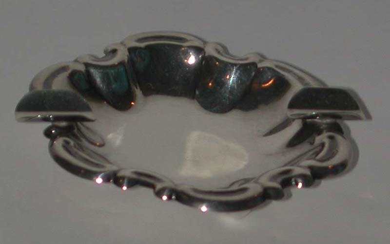Cinzeiro redondo sobre três pés em bola, borda recortada com dois suportes para cigarro.;