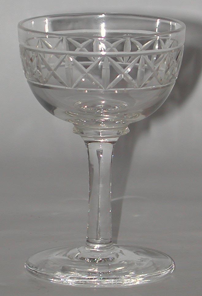 Cálice, bojo entalhado com faixa decorativa motivo ponta de diamante, pé liso e transparente sobre base redonda.; Serviço "ponta de diamante" composto por 18 peças de EK02382 até EK02399.