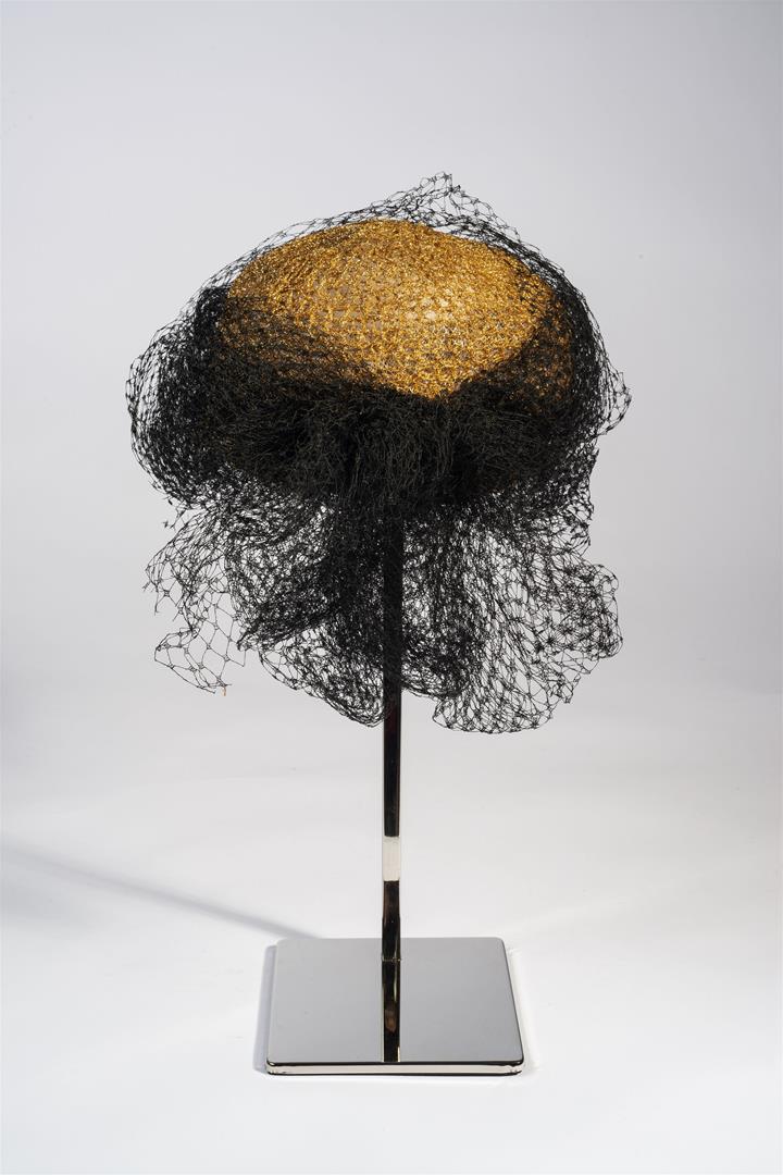 Chapéu dourado com renda preta.;