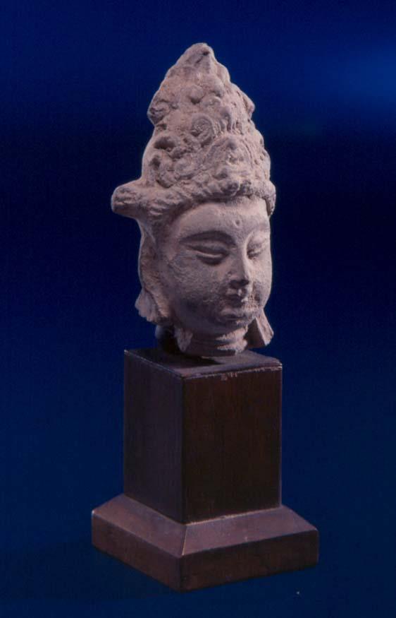 Cabeça de Bodhisattva de terracota com penteado elaborado, sobre base de madeira.;