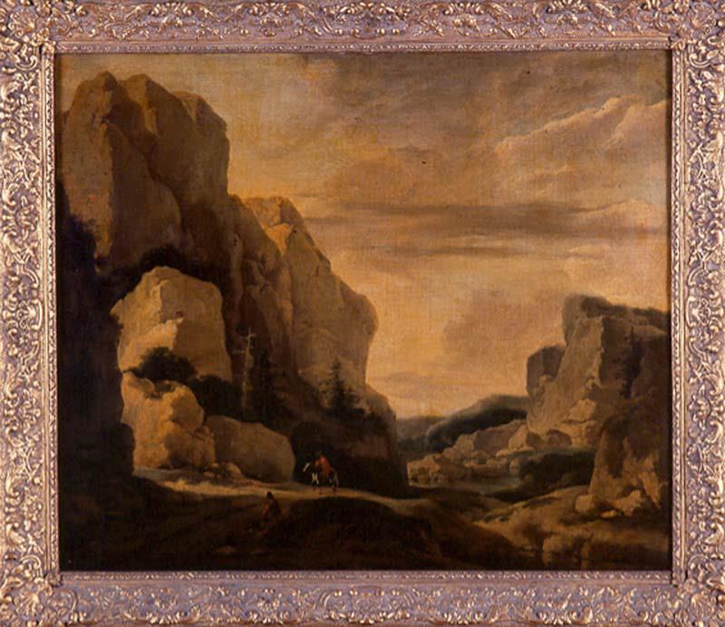 Paisagem rochosa com desfiladeiro, em tons de cinza, branco, preto e vermelho; em primeiro plano duas figuras pequenas, uma delas montada a cavalo. Observa-se a presença de uma pequena cabra no topo de um rochedo, representando o artista que atinge lugares inacessíveis.;